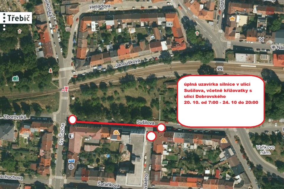Z důvodu výměny povrchu silnice v ulici Sušilova bude od 20. října od 7:00 do 24. října do 20:00 úplná uzavírka v úseku ulice od křižovatky s ulici Sv. Čecha po křižovatku s ulicí Dobrovského, včetně této křižovatky.